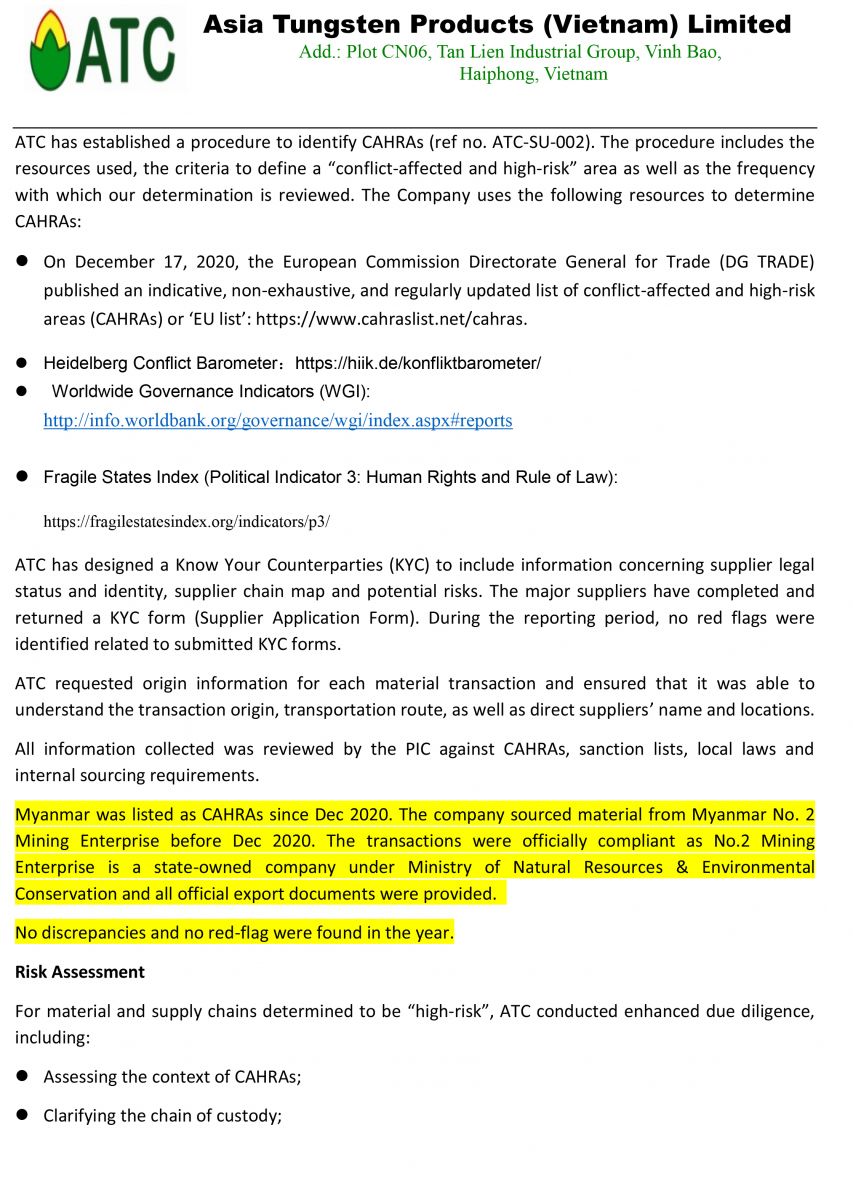 Asia Tungsten Products Co Ltd is a Hong Kong based Joint Venture company established in 2009 (CID NO. 1385233). The company owns 100% of the Vietnamese charter capital company Asia Tungsten Products Vietnam Ltd which operates a ferrotungsten refinery facility located in the Vinh Bao District, Haiphong, Vietnam (“ATC”).