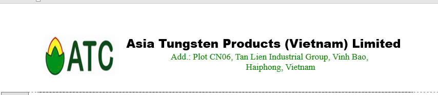 ..Asia Tungsten Products Co Ltd is a Hong Kong based Joint Venture company established in 2009. The company owns 100% of the Vietnamese charter capital company Asia Tungsten Products Vietnam Ltd which operates a ferrotungsten refinery facility located in Vinh Bao District, Haiphong, Vietnam (“ATC”). The processed material is Tungsten and CID No. is CID002502. This report covers the due diligence activities of ATC in the calendar year of 2023....
