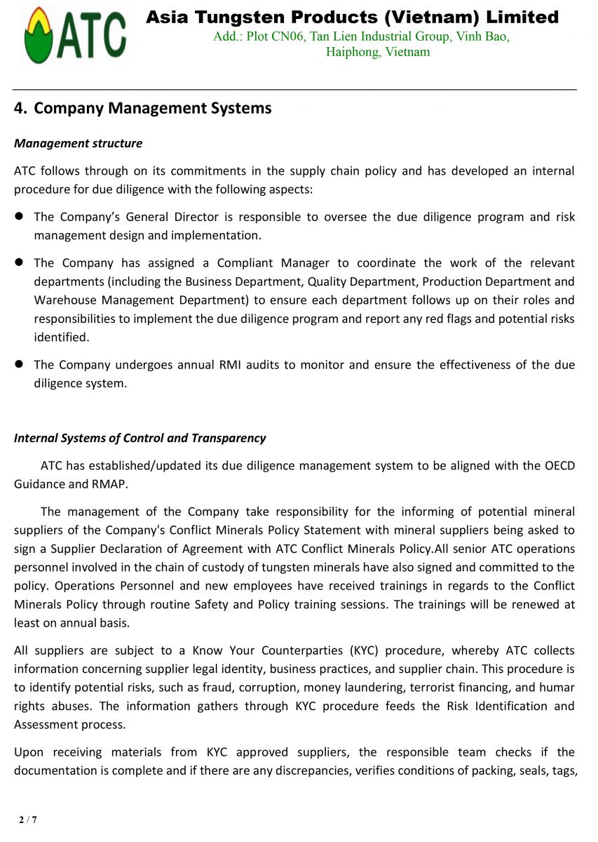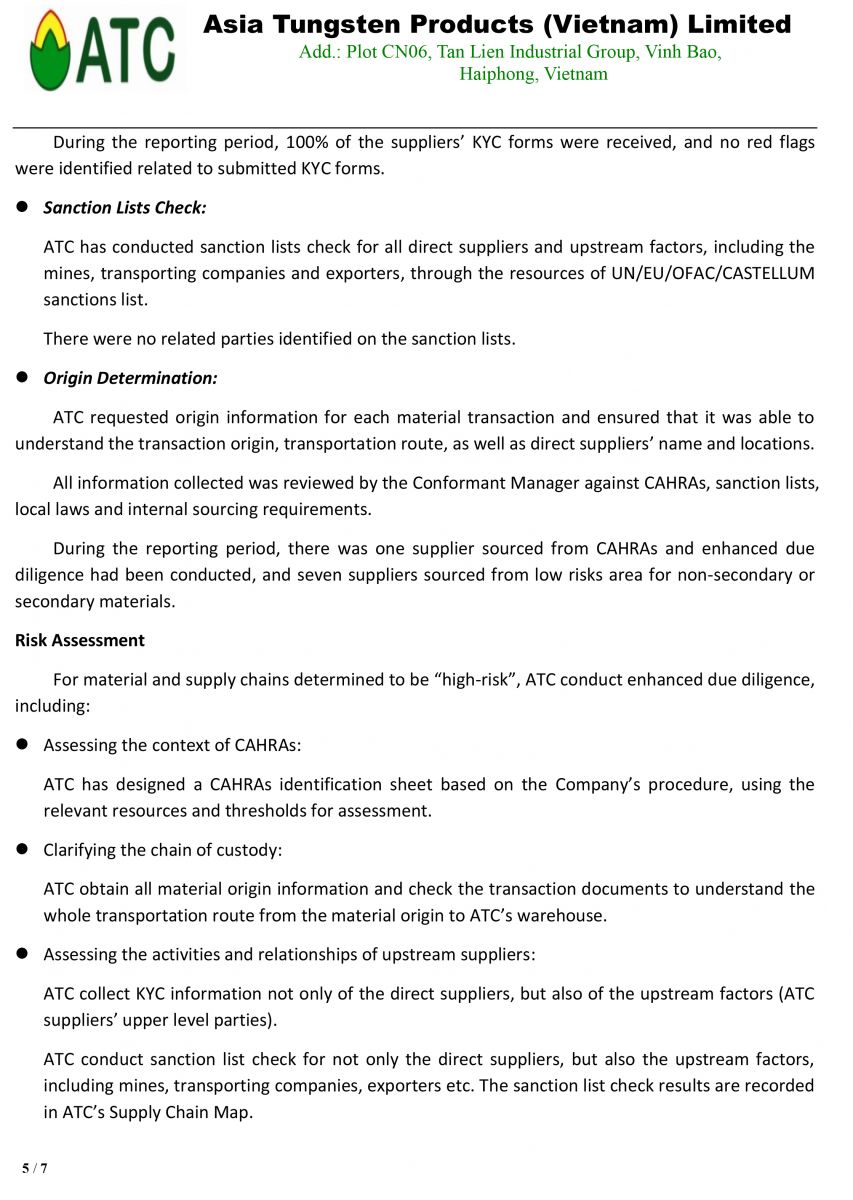 ..Asia Tungsten Products Co Ltd is a Hong Kong based Joint Venture company established in 2009. The company owns 100% of the Vietnamese charter capital company Asia Tungsten Products Vietnam Ltd which operates a ferrotungsten refinery facility locates in Vinh Bao Commune., Haiphong, Vietnam (“ATC”). The processed material is Tungsten concentrate and other tungsten contained secondary materials mainly sourced from Africa, Vietnam and other Asian countries. ATC is the RMI conformant smelter and CID No. is CID002502. This report covers the due diligence management system and activities of ATC from 1 Jan 2025 to 31 Dec 2025...